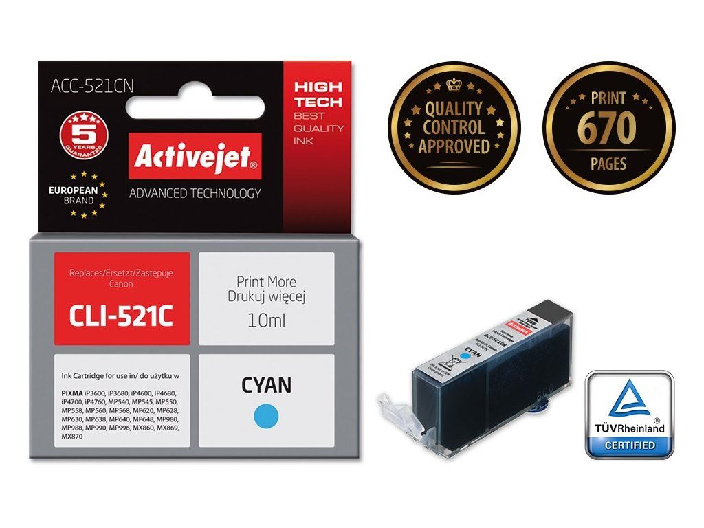 Activejet Inkoust ACC-521CN (náhradní inkoust Canon CLI-521C; Supreme; 10 ml; modrý)