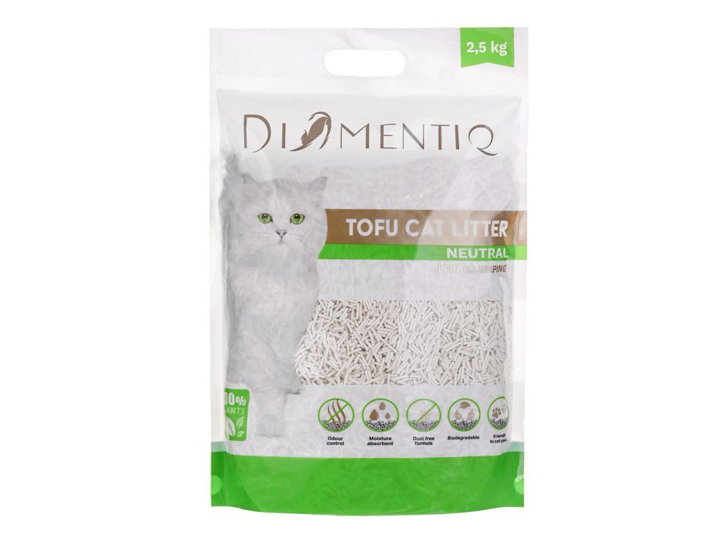 DIAMENTIQ Tofu Neutral Ultra clumping - rostlinné stelivo - 2,5 kg| Materiál | Hrachové vlákno, Kukuřičný škrob |