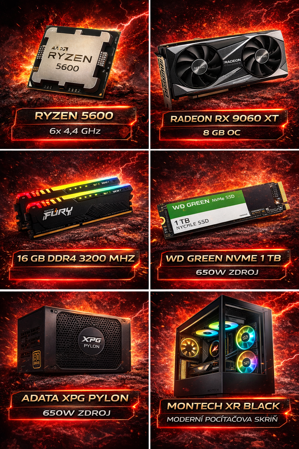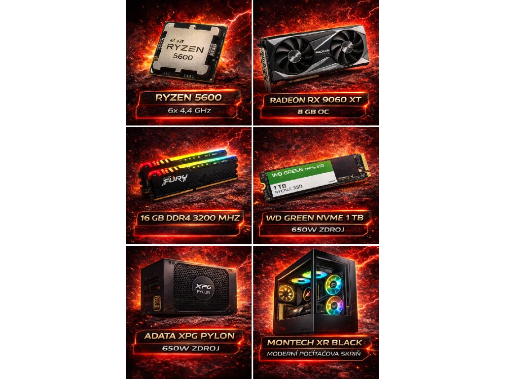O osvědčený výkon se stará AMD Ryzen 5 5600 – šestijádrový procesor, který zvládá moderní hry, multitasking i běžnou práci bez zaváhání. Ve spojení s Radeon RX 9060 XT 8GB nabídne plynulé FPS a skvělý herní zážitek ve Full HD rozlišení.