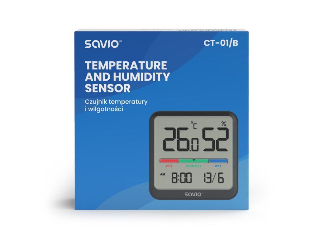 SAVIO Bezdrátová meteostanice, čidlo teploty a vlhkosti, vnitřní použití, LCD displej, hodiny, datum, rukojeť s magnetem, CT-01/B Black| Výška balení | 79 mm |