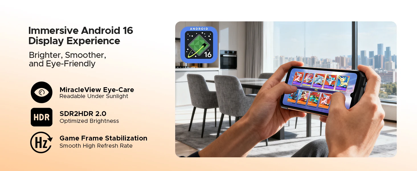 Oranžový telefonS oranžovými sluchátkySystémAndroid 16
