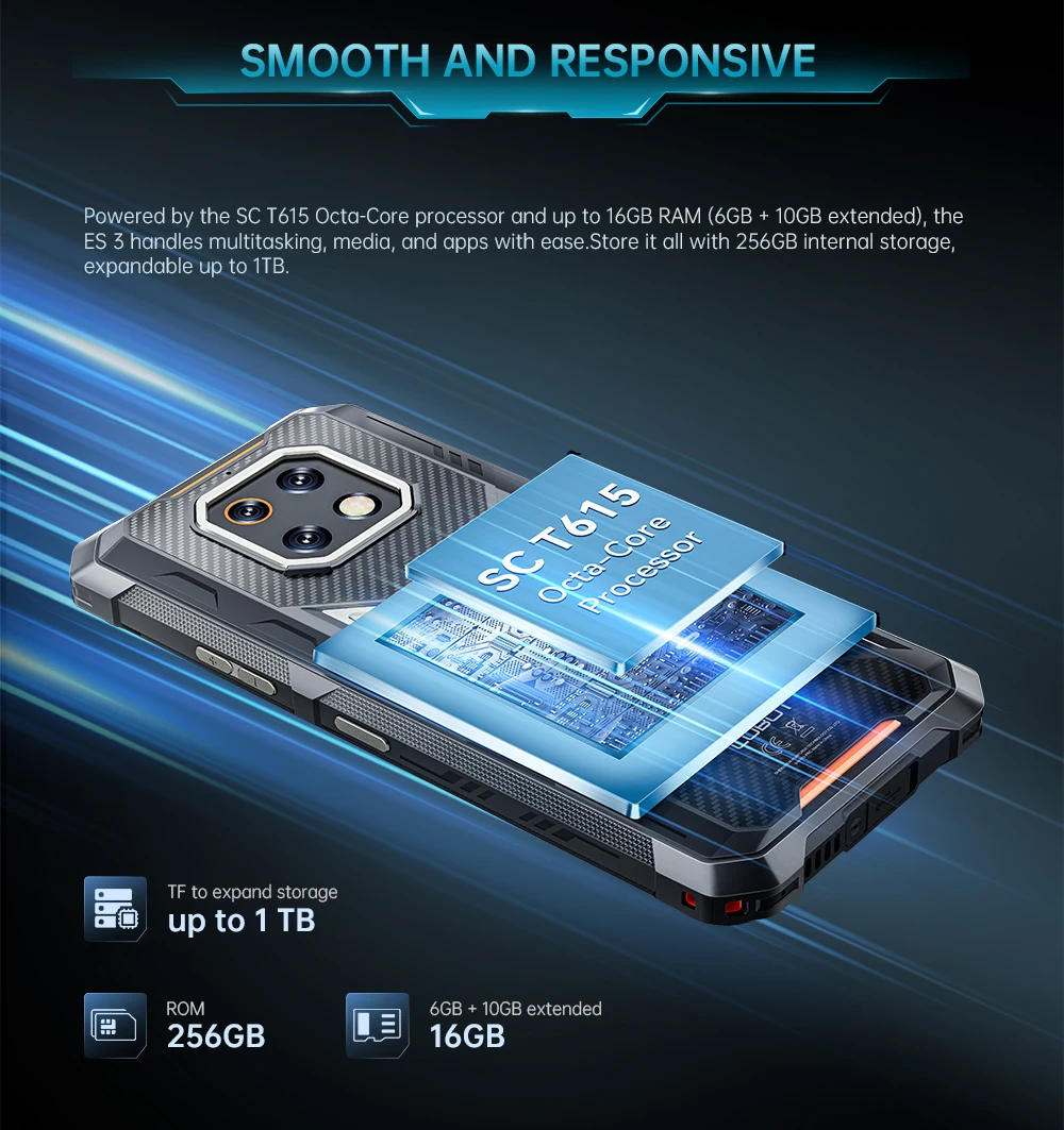 Díky osmijádrovému procesoru SC T615 a až 16 GB RAM (6 GB + 10 GB rozšiřitelná paměť) si ES 3 snadno poradí s multitaskingem, médii a aplikacemi.
