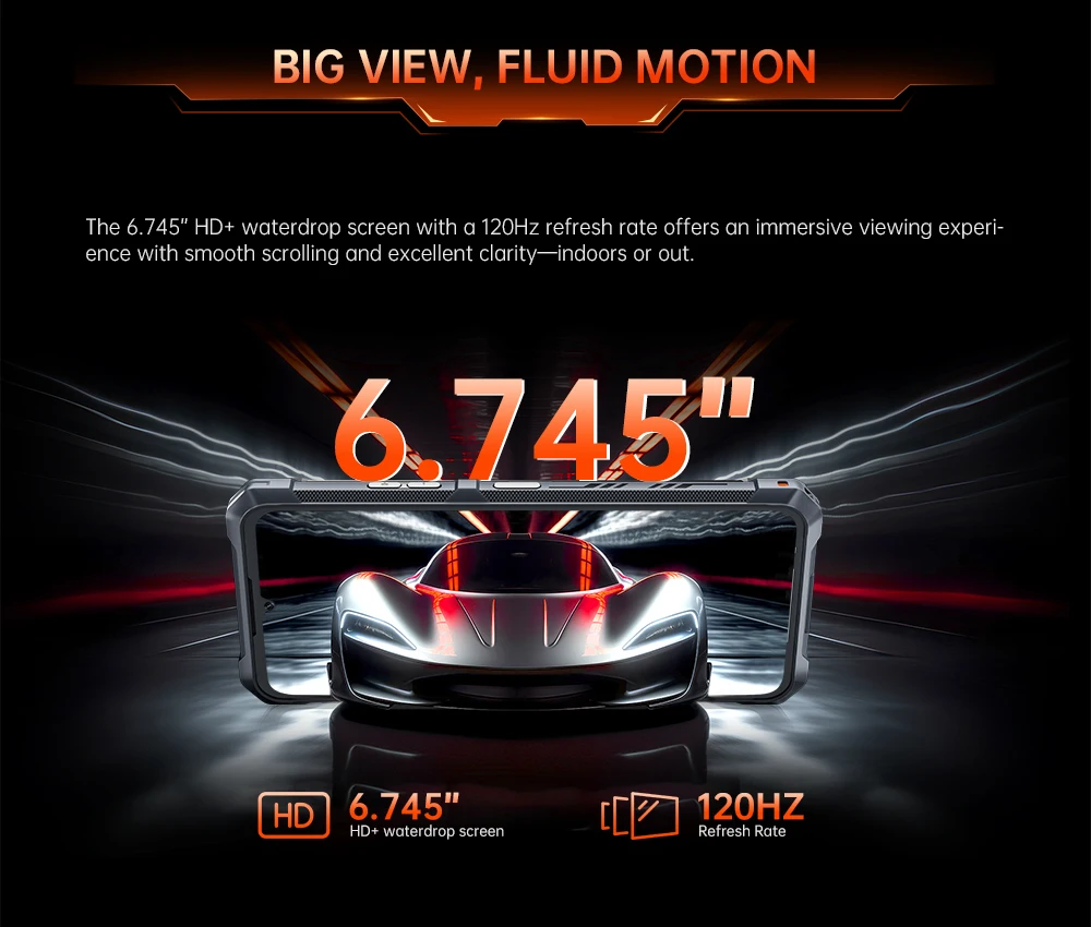 6,745" HD+ kapkovitý displej s obnovovací frekvencí 120 Hz nabízí pohlcující zážitek ze sledování s plynulým posouváním a vynikající čistotou obrazu – uvnitř i venku.