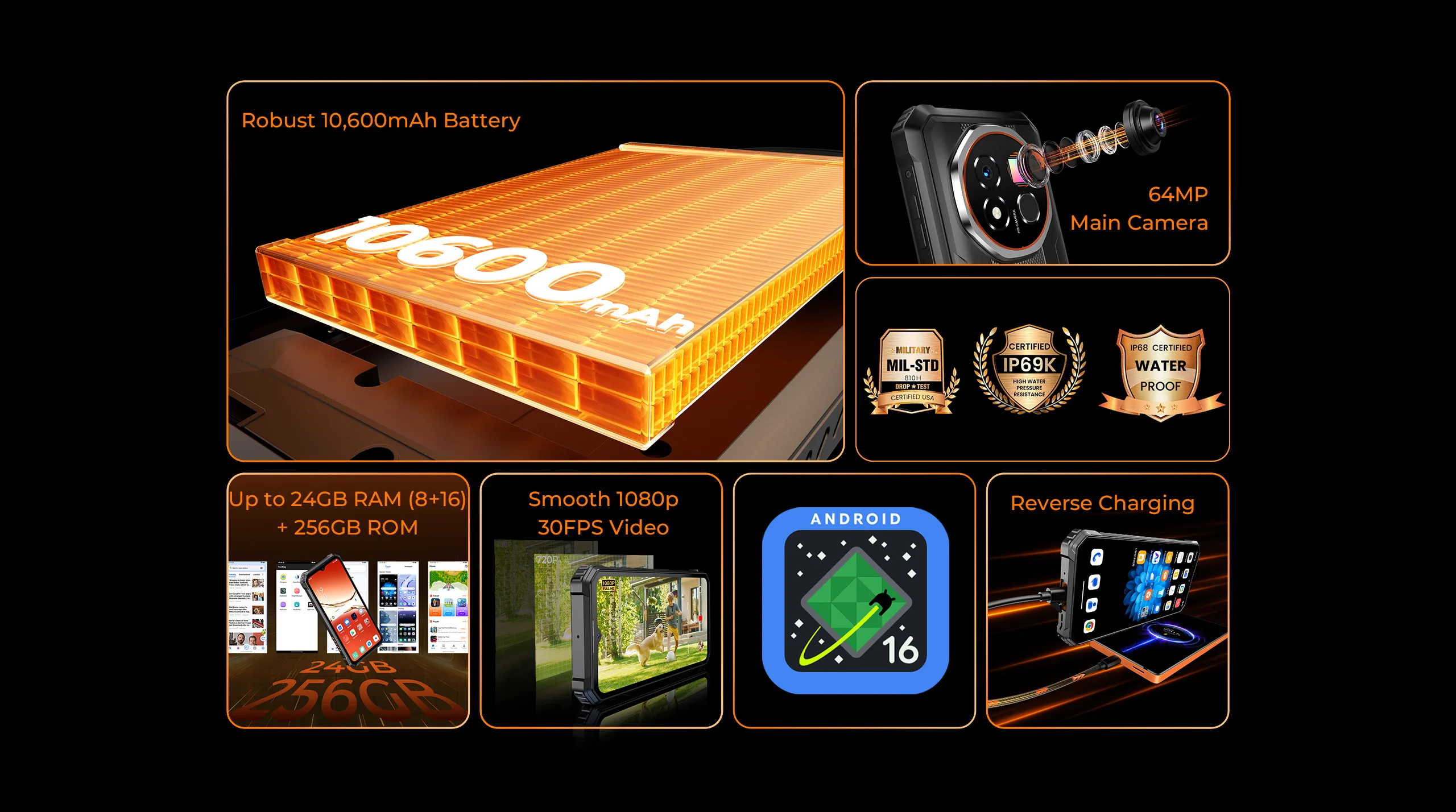 Odolný telefon Oukitel WP300, 16 000 mAh, Dimensity 7050, 5G, 12 GB + 512 GB, modulární, přenosná sluchátka/kempovací světlo, 6,78" FHD, 120 Hz, 108 MP Všechny EU jazyky