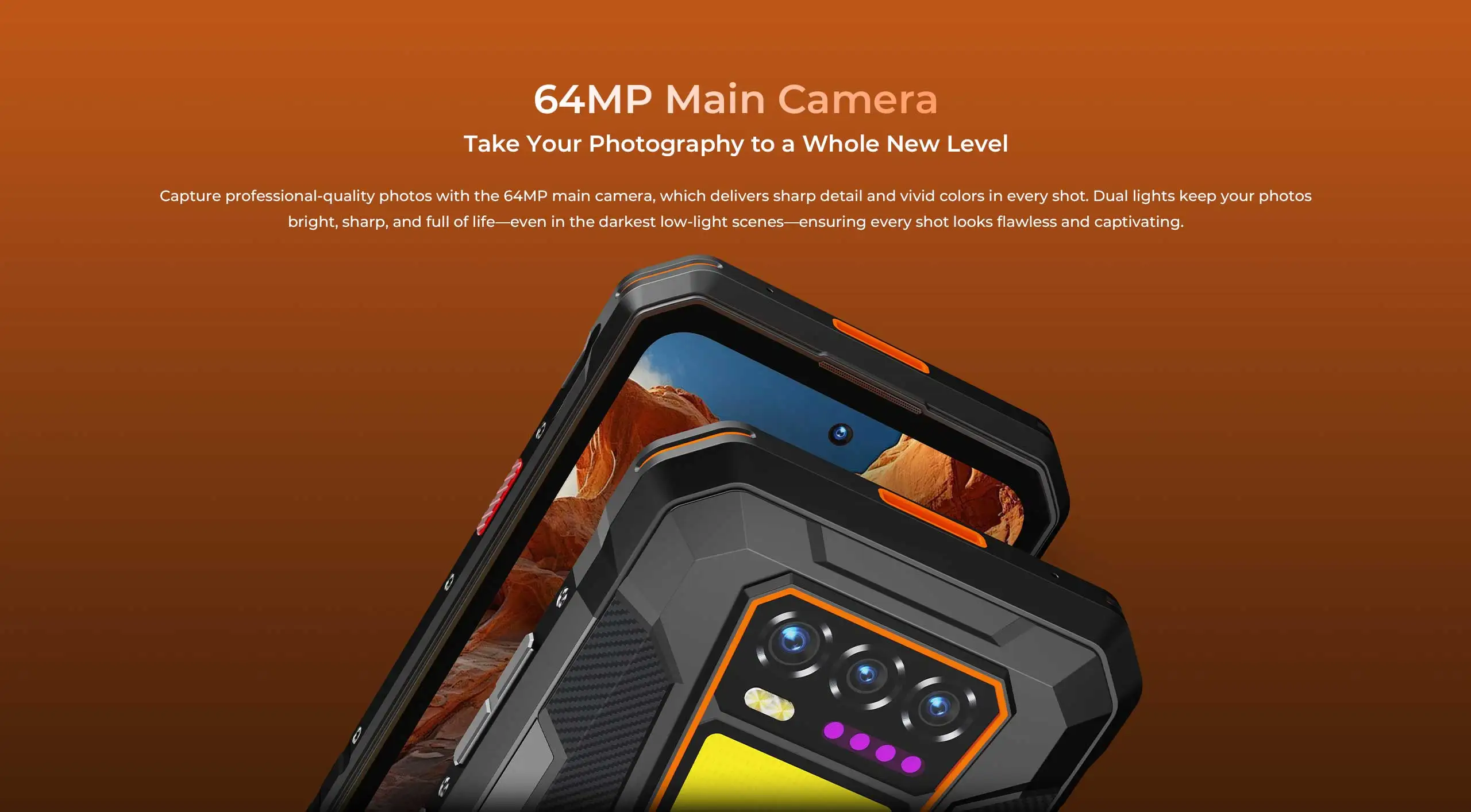 Pořizujte profesionální fotografie s hlavním 64MP fotoaparátem, který poskytuje ostré detaily a živé barvy v každém záběru. Dvojité světlo udržuje vaše fotografie jasné, ostré a plné života – i v těch nejtmavších scénách se slabým osvětlením – takže každý snímek vypadá bezchybně a poutavě. Standardy IP68/IP69K,