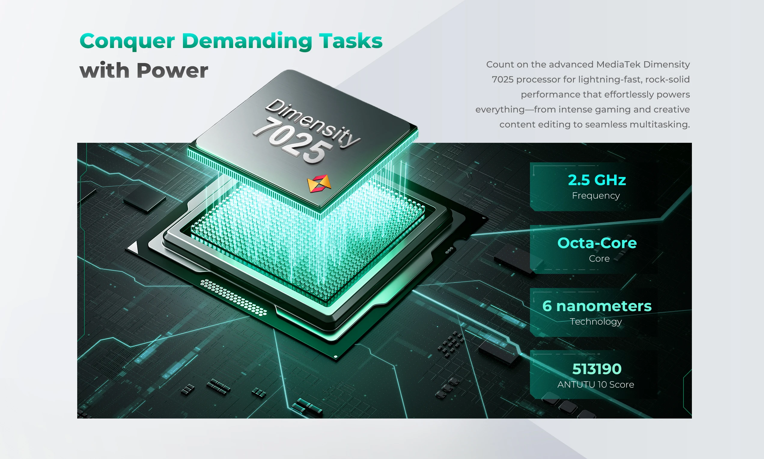 Model CPU: MTK Dimensity 7025, osmijádrový (2x 2,5 GHz – Cortex-A78; 6x 2,0 GHz – Cortex-A55)