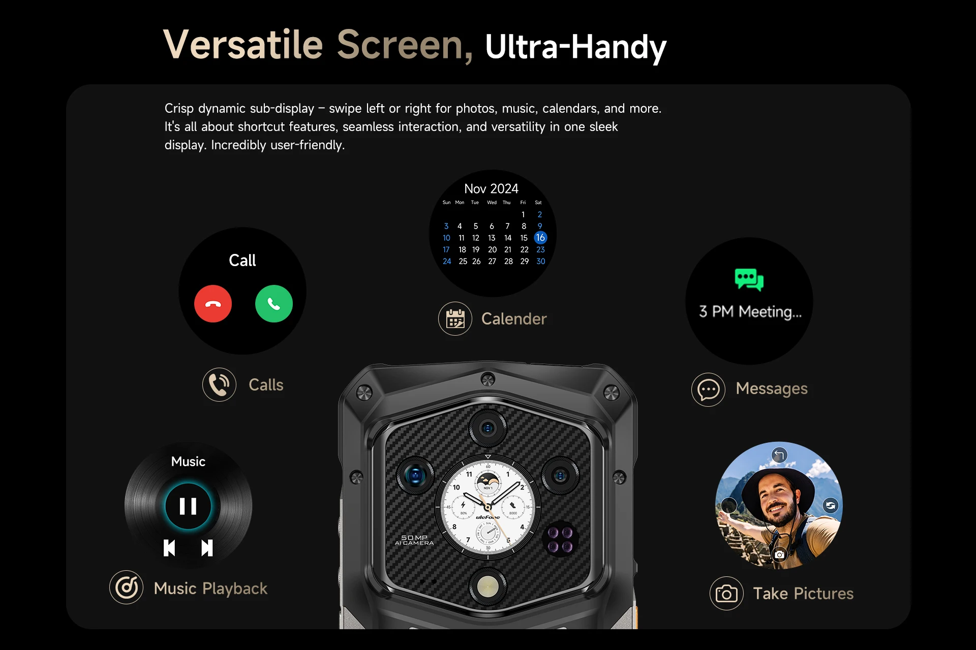 Ostrý dynamický vedlejší displej – přejetím prstu doleva nebo doprava zobrazíte fotografie, hudbu, kalendáře a další. Všechno se točí kolem funkcí zkratek, bezproblémové interakce a všestrannosti v jednom elegantním displeji. Neuvěřitelně uživatelsky přívětivý.