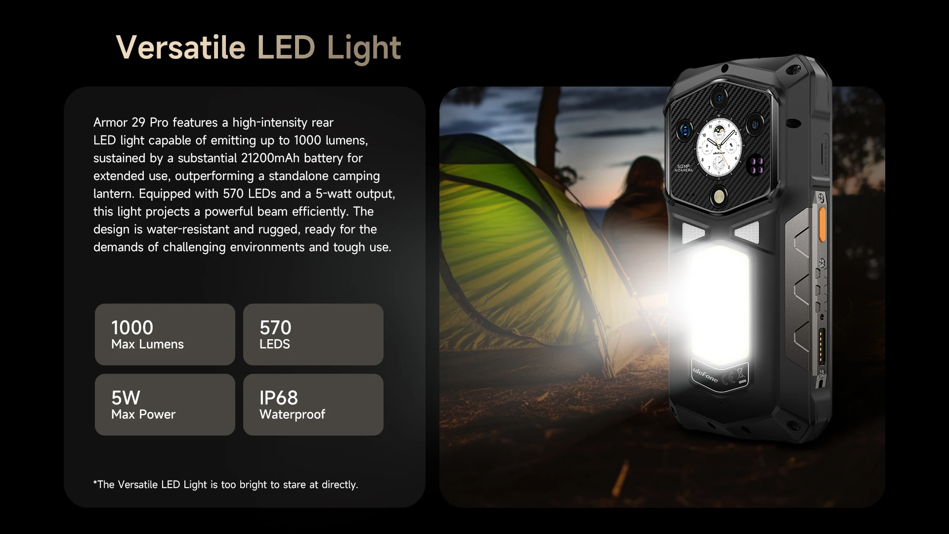 Armor 29 Pro je vybaven vysoce intenzivním zadním LED světlem, které dokáže vyzařovat až 1000 lumenů a je napájeno robustní baterií s kapacitou 21200 mAh pro delší používání, čímž překonává samostatnou kempingovou lucernu. Toto světlo je vybaveno 570 LED diodami a výkonem 5 wattů, takže efektivně vyzařuje silný paprsek. Konstrukce je voděodolná a robustní, připravená na nároky náročného prostředí a náročného používání.