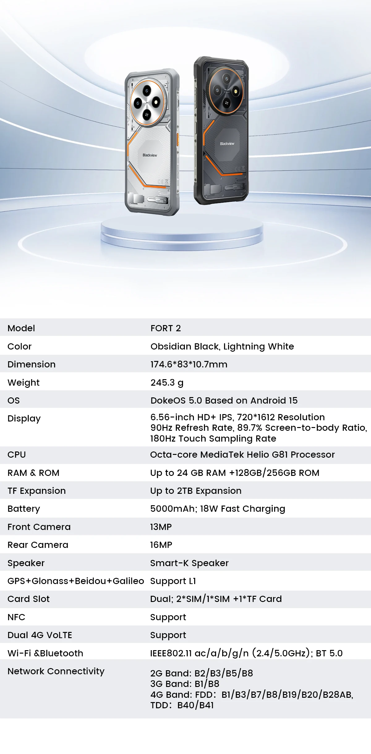 Blackview FORT 2 v konfiguraci 8 GB RAM / 128 GB ROM je odolný chytrý telefon uvedený na trh koncem roku 2025. Tento model se vyznačuje kombinací vysoké odolnosti a překvapivě tenkého designu (pouhých 10,7 mm), což jej odlišuje od typických masivních outdoorových telefonů.