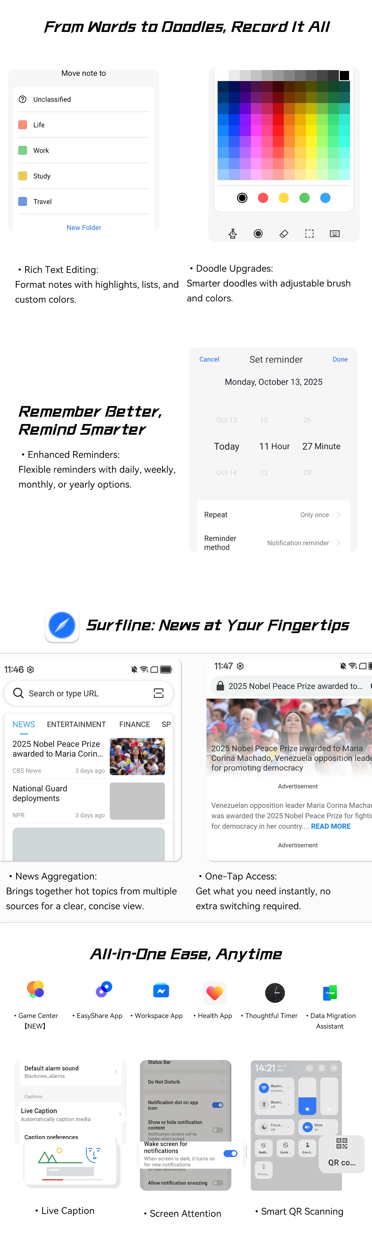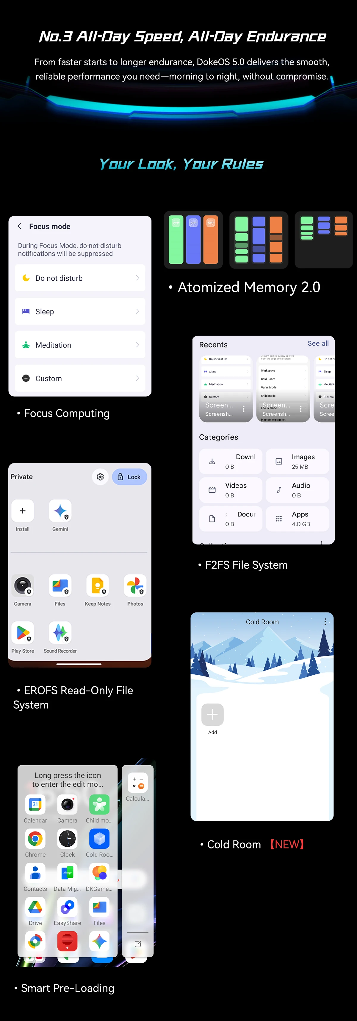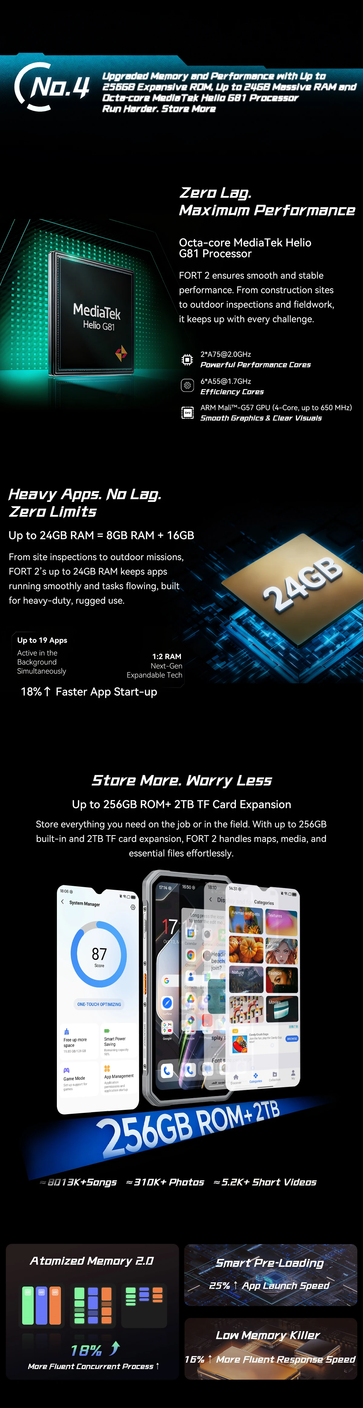 - Paměť: 8 GB RAM (možnost virtuálního rozšíření až na 24 GB) a 128 GB vnitřního úložiště s podporou microSD karet až do 2 TB.