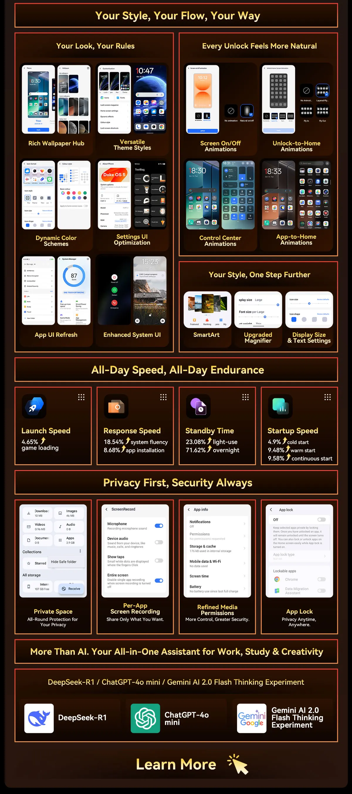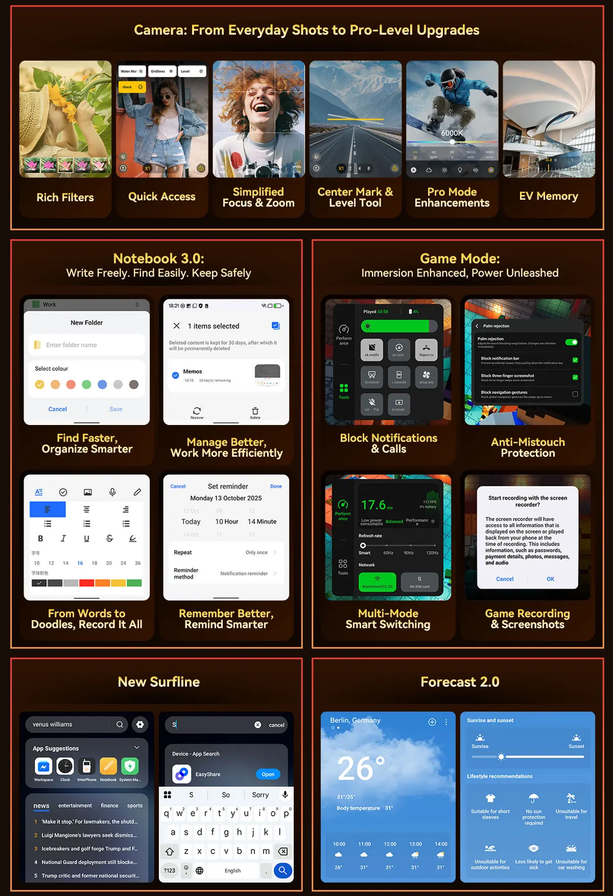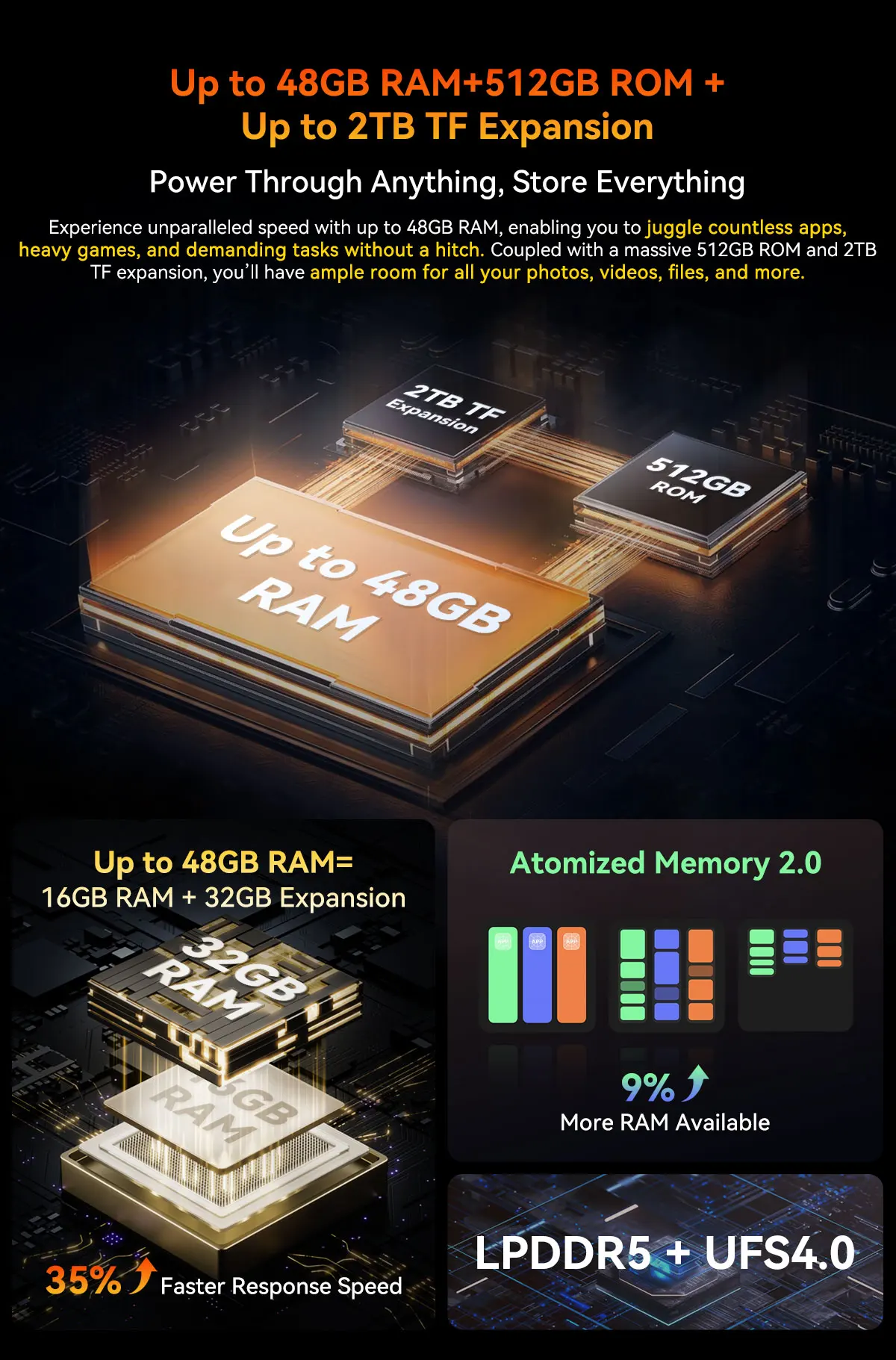 - Paměť: 12 GB RAM LPDDR5 (rozšiřitelná až na 36 GB virtuálně) a 256 GB úložiště UFS 3.1.