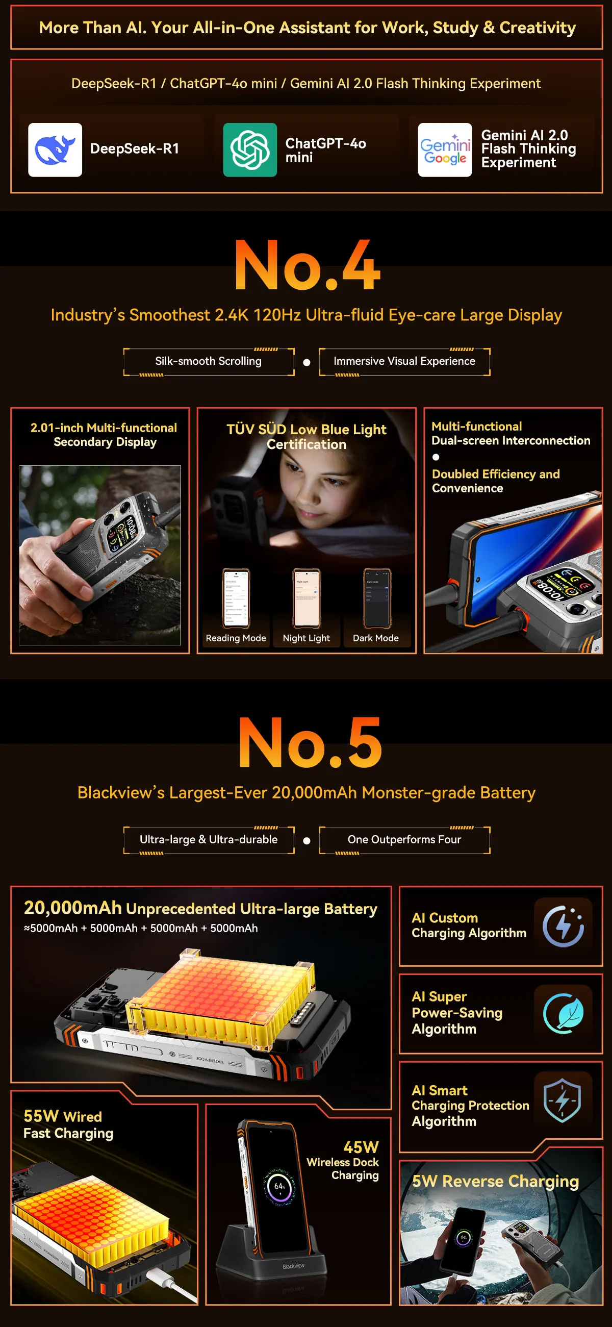 - Obří baterie: Kapacita 20 000 mAh s podporou 55W rychlonabíjení (kabelové) a 45W bezdrátového nabíjení. Slouží také jako powerbanka díky 5W reverznímu nabíjení.