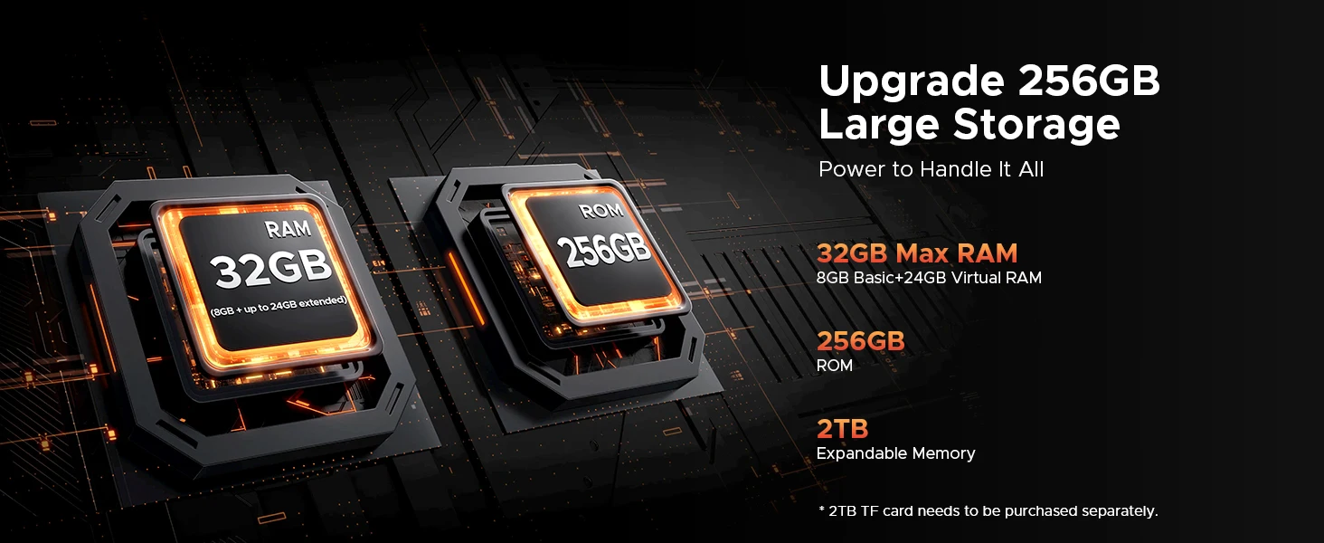 - Paměť: 8 GB RAM (rozšiřitelná o dalších 24 GB virtuální RAM) a 256 GB vnitřního úložiště (podpora microSD karet až do 2 TB).