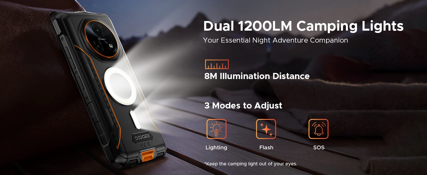 Extrémní svítilna: Na zadní straně se nachází dvě výkonná LED světla se svítivostí až 1 200 lumenů, která osvětlí prostor do vzdálenosti 8 metrů a podporují režimy stálého svícení, stroboskopu a SOS.
