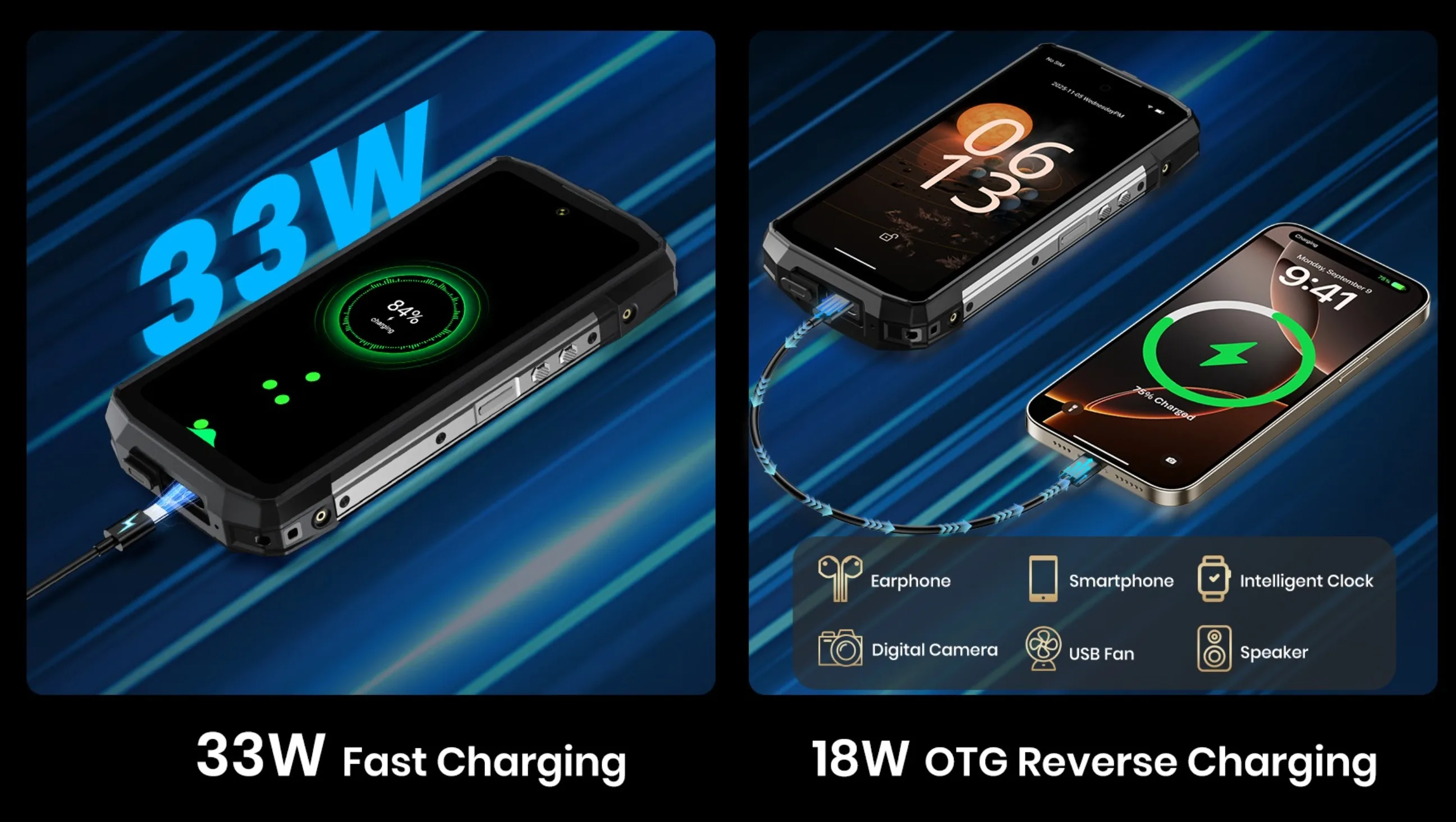 - Obří baterie: Kapacita 20 000 mAh zajišťuje výdrž na mnoho dní aktivního používání. Podporuje 33W rychlonabíjení a 18W reverzní nabíjení pro napájení jiných zařízení.