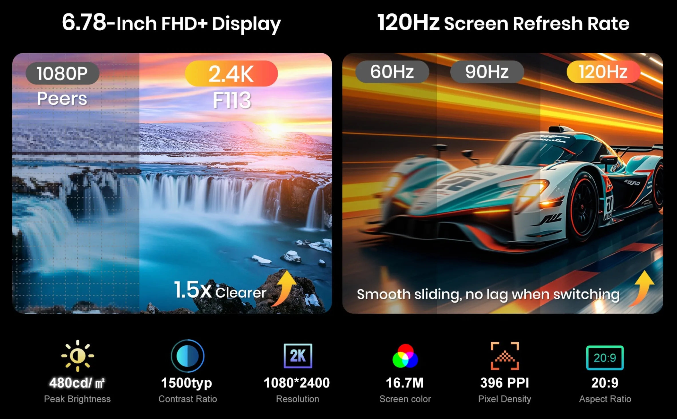 Displej: 6,78" FHD+ IPS panel s obnovovací frekvencí 120 Hz a ochranou Corning Gorilla Glass 3.