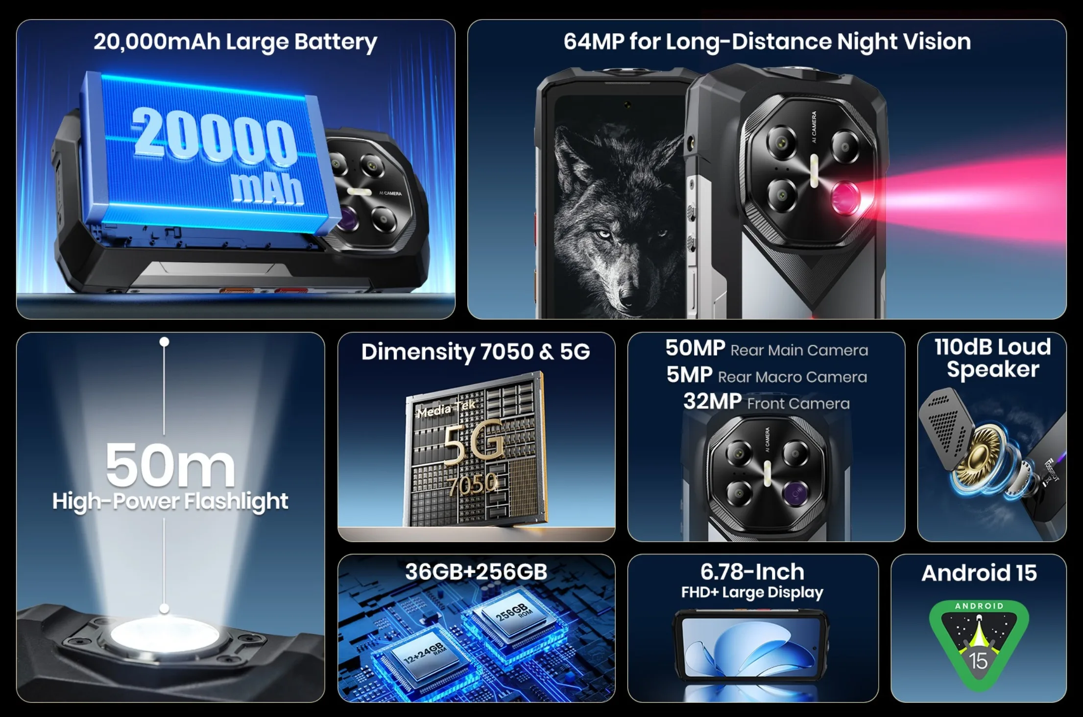 FOSSiBOT F113 (12 GB RAM / 256 GB ROM) je extrémně odolný 5G chytrý telefon uvedený na trh koncem roku 2025. Je navržen pro nejnáročnější outdoorové podmínky a profesionální využití, přičemž jeho unikátní vlastností je dosah nočního vidění a obří kapacita baterie.