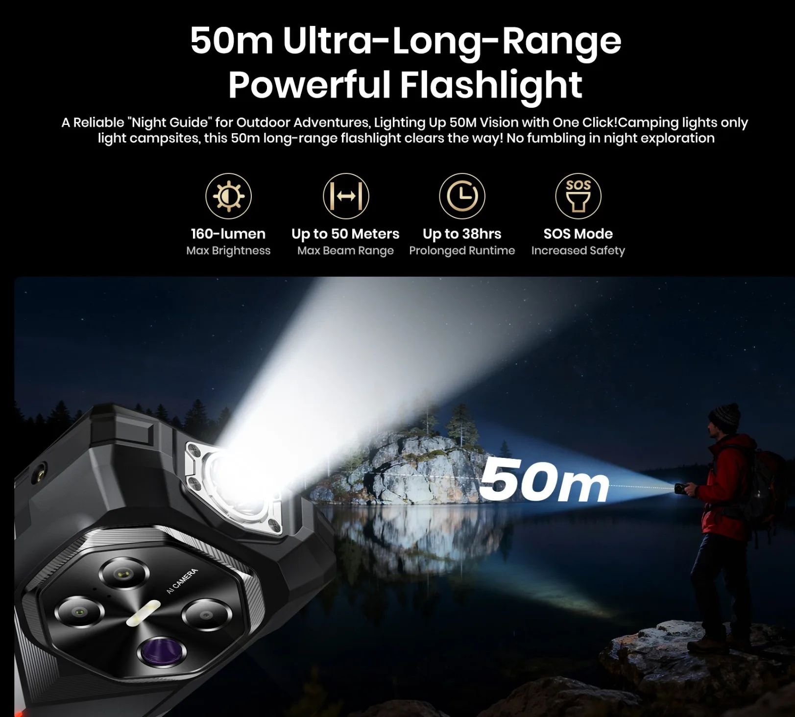 - Výkonná svítilna: Integrovaná 1,5W LED svítilna se svítivostí schopnou osvětlit objekty až na vzdálenost 50 metrů.