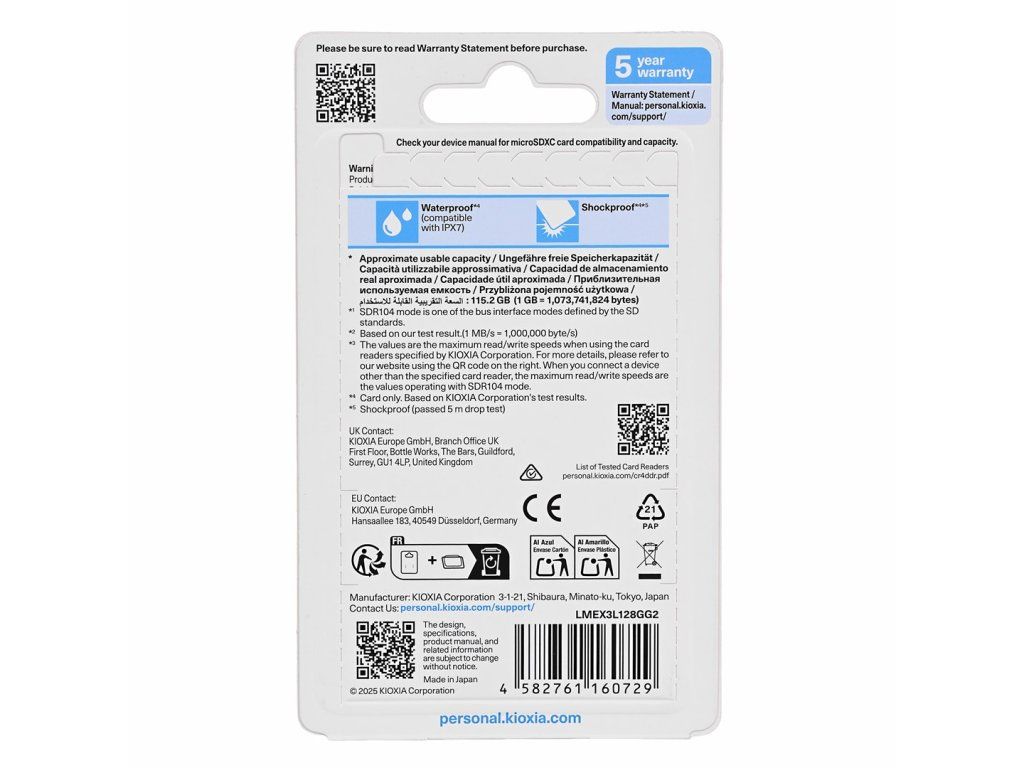 Kioxia EXCERIA G3 128 GB MicroSDXC UHS-I Třída 10| Ochranné funkce | Odolnost proti nárazu, Voděodolný |