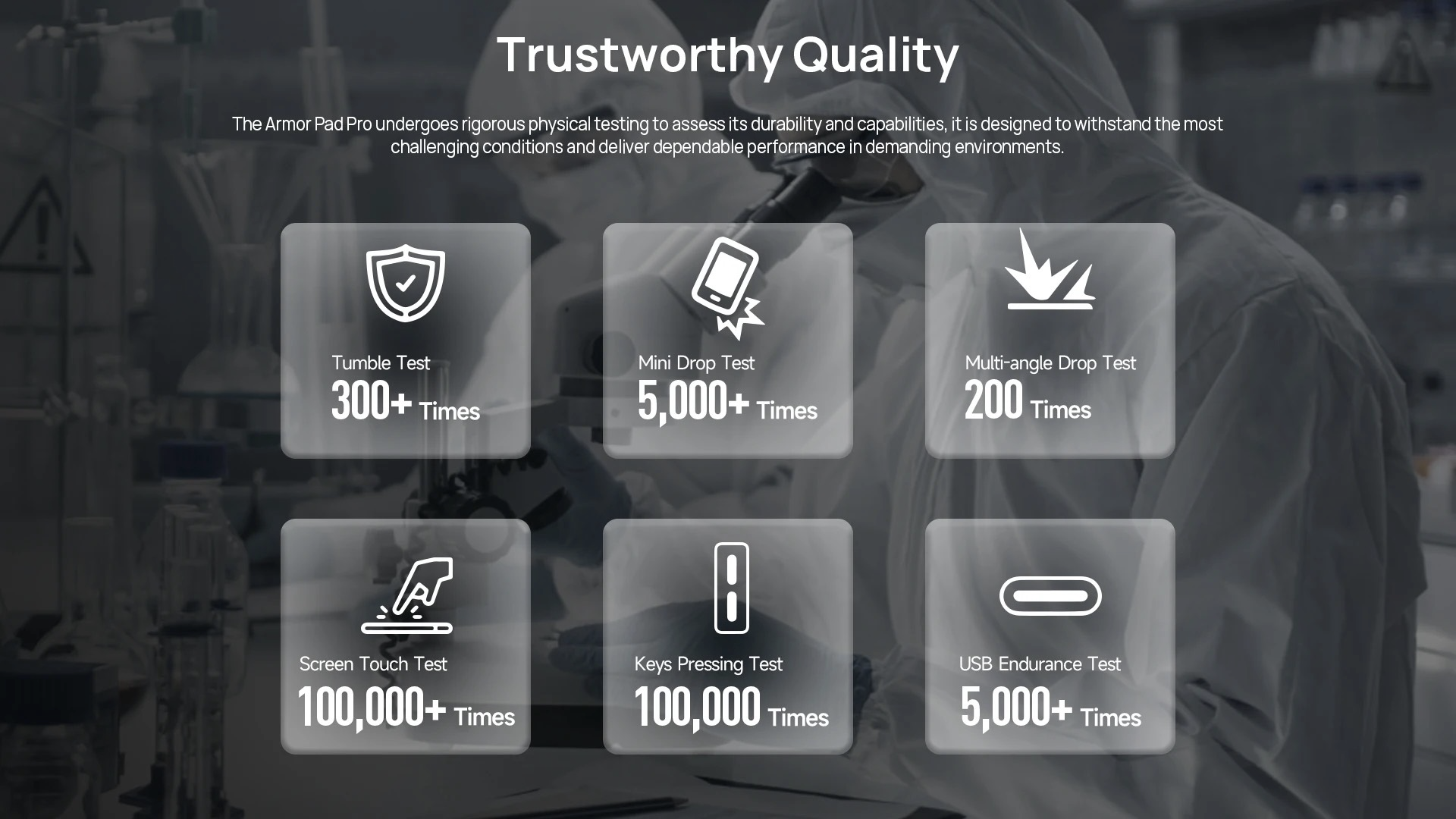 Jste plní energie a Armor Pad Pro také. Jeho obrovská kapacita baterie 7 650 mAh je dvakrát větší než u iPadu Mini a přibližně stejná jako u iPadu Pro 11. Poskytuje vám jistotu, že zvládnete celý pracovní den nebo outdoorové aktivity s až 14 hodinami intenzivních úkolů, týmovou komunikací, GPS sledování a sledování videa.