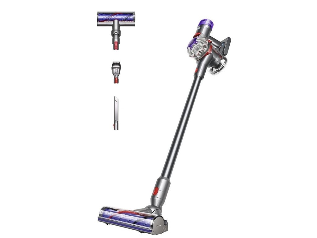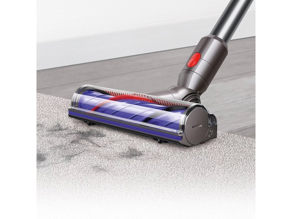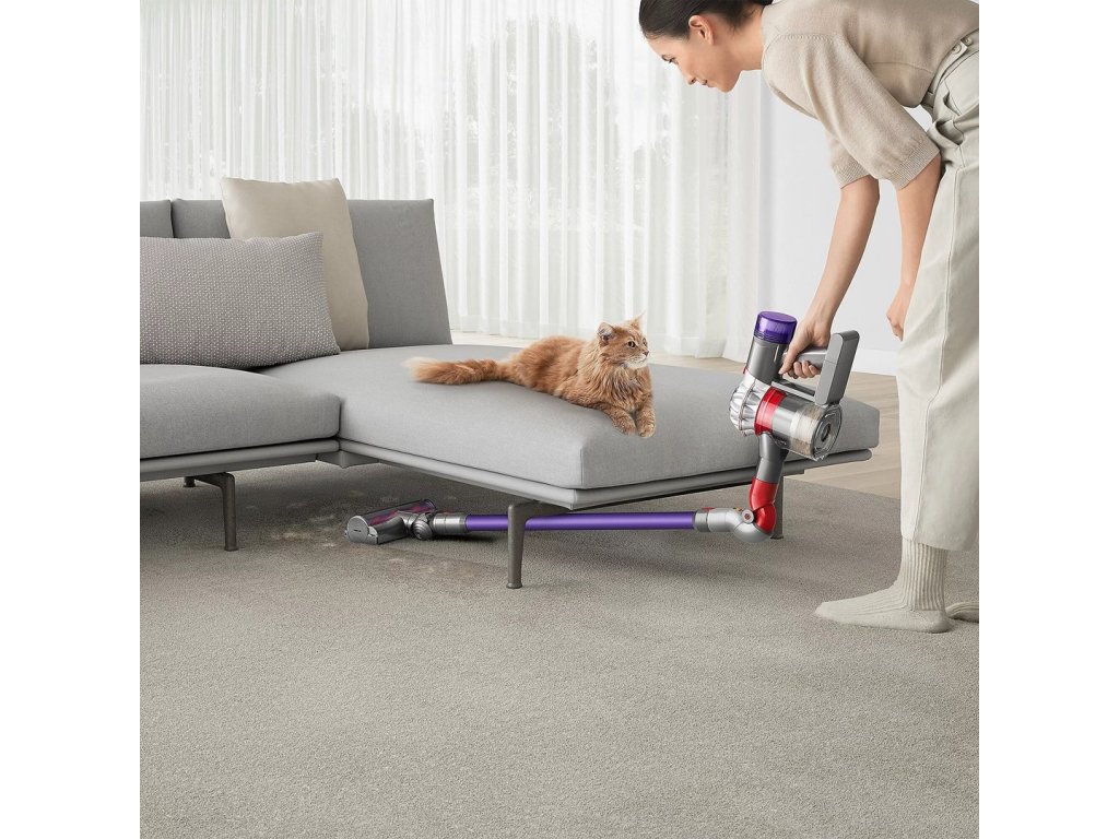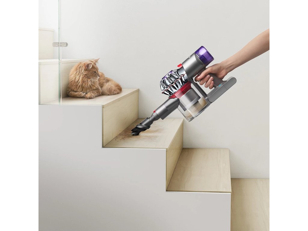 Tyčový vysavač Dyson V8 s množstvím vyměnitelných nástavců na úklid podlahy, stropu, či sedací soupravy je poháněný novým digitálním motorem Dyson V8. Díky vysoké sací síle vysaje špínu a zvířecí chlupy takřka z každého povrchu, zákoutí a úzkých mezer. Kvalitní baterie vydrží až 40 minutový provoz, přičemž její nabití trvá 3,5 hodiny. Součástí vysavače je také zásobník na nečistoty o objemu 0.54 L, který lze snadno vyprázdnit pouhým stisknutím jednoho tlačítka.