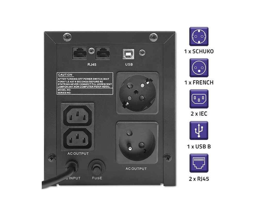 Qoltec 53770 zdroj nepřerušovaného napětí Line-interaktivní 1,5 kVA 900 W 2 AC zásuvky / AC zásuvek| Prvky ochrany napájení | Přepětí, Zkrat, Podpětí, Přetížení, Vstupní pojistka |
