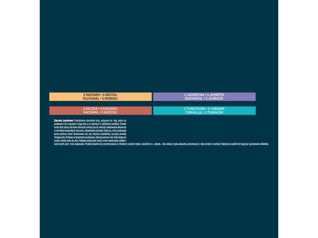 | Příchuť krmiva | Kachna, Turecko, Tuňák, Jehněčí |